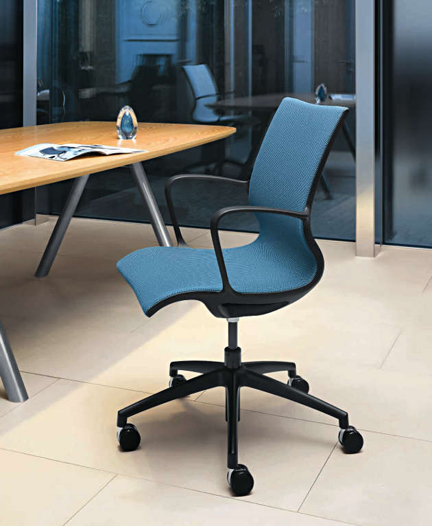Der drehbare Konferenzsessel überzeugt durch seine stilvolle Erscheinung mit schlanker Silhouette und ausgeformter Sitzschale, wobei der geschwungene Rücken die Wirbelsäule wohltuend entlastet. Vom Rücken reicht der großzügige Bogen der Armlehne bis seitlich zum Gestell. Behutsamen Halt bekommen die frei schwingenden Konferenzstühle in der schlüssigen fliligranen Gestalt des Fußkreuzes. Die fließende Form der Sitzschale harmoniert mit dem Schwung aus Armlehnen und Fußkreuz. Die Design-Armlehne, farblich passend abgestimmt auf die Gestellfarben.