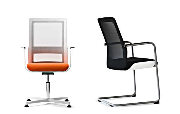 - Konferenzfreischwinger mit Armlehnen, Sitz gepolstert, Rücken Netzbespannung, Sitz gepolstert und Rücken voll umpolstert.